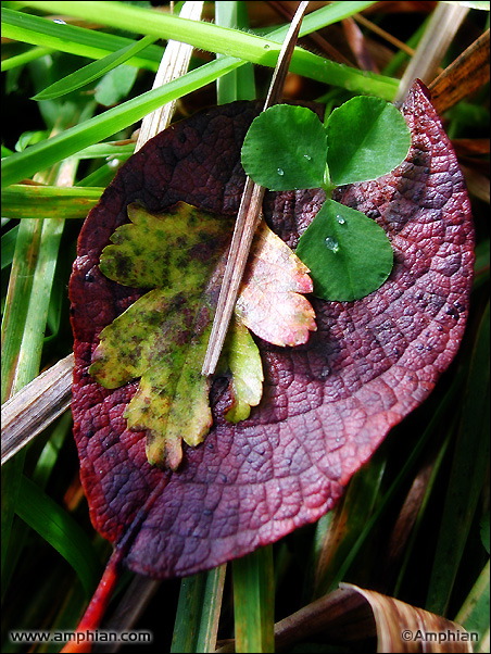 This trio of leaves was photographed on an early autumn morning. The leaves nestled in the grass are beech, oak, and clover, which still retains a few drops of the morning dew.